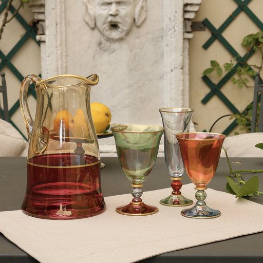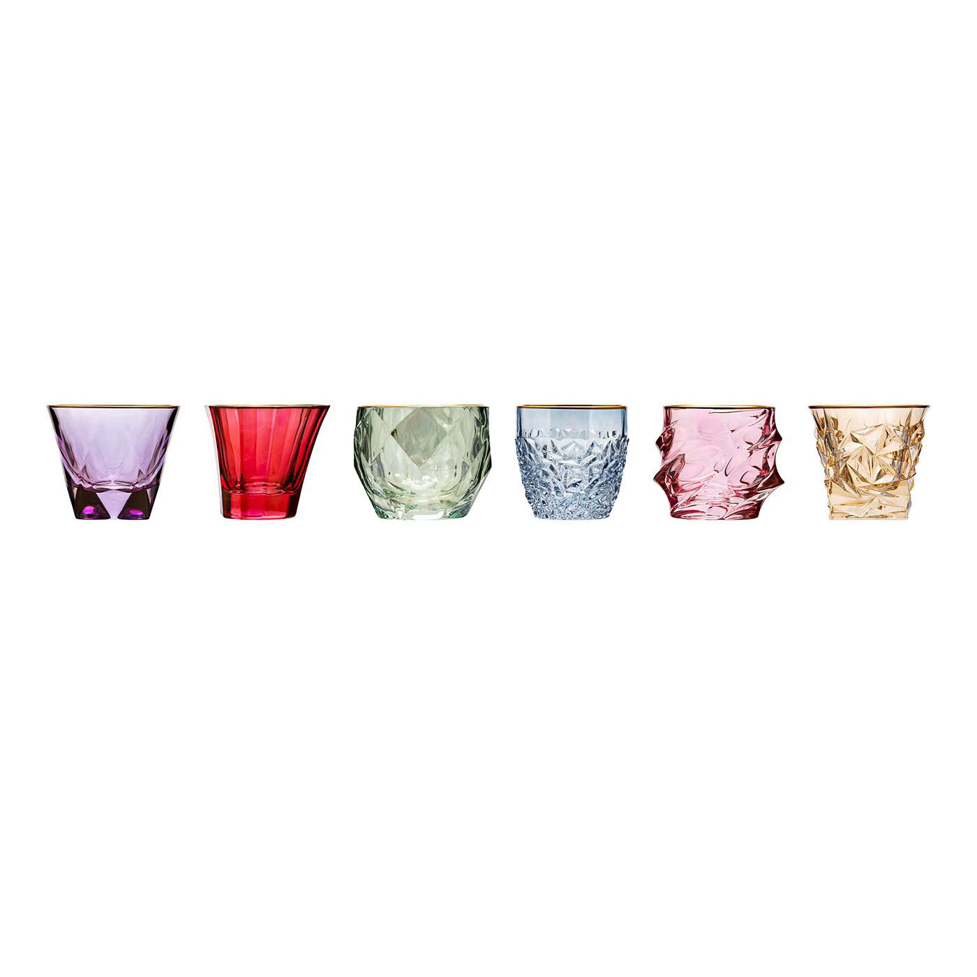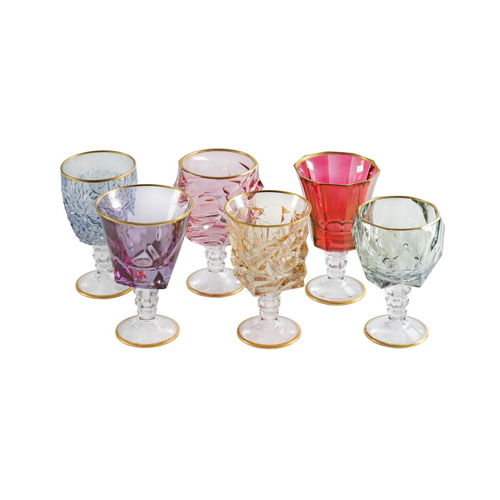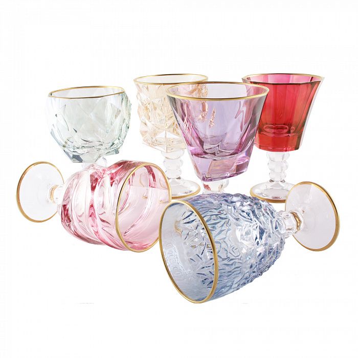📏 Характеристики набора: · Тип: Набор бокалов для вина, коктейлей, воды и любых напитков · Количество: 6 бокалов · Материал: Стекло с ободком из 24-каратного золота · Дизайн: Цветные бокалы · Производитель: Griffe Montenapoleone, Италия 🇮🇹